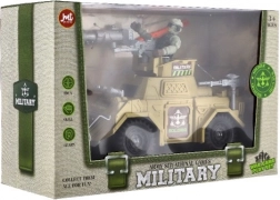 Voiture en plastique robuste avec accessoires tactiques, roues à roue libre et surface détaillée pour une action militaire fidèle.