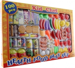 Grand ensemble de nourriture. L’emballage contient au total 100 pièces (fruits, légumes, pains et viennoiseries, friandises, boîtes de conserve et boissons en carton). Dimensions de l’emballage : environ 58 × 39 × 5 cm. Âge 3+