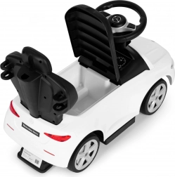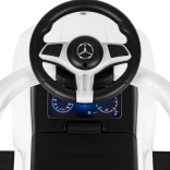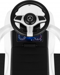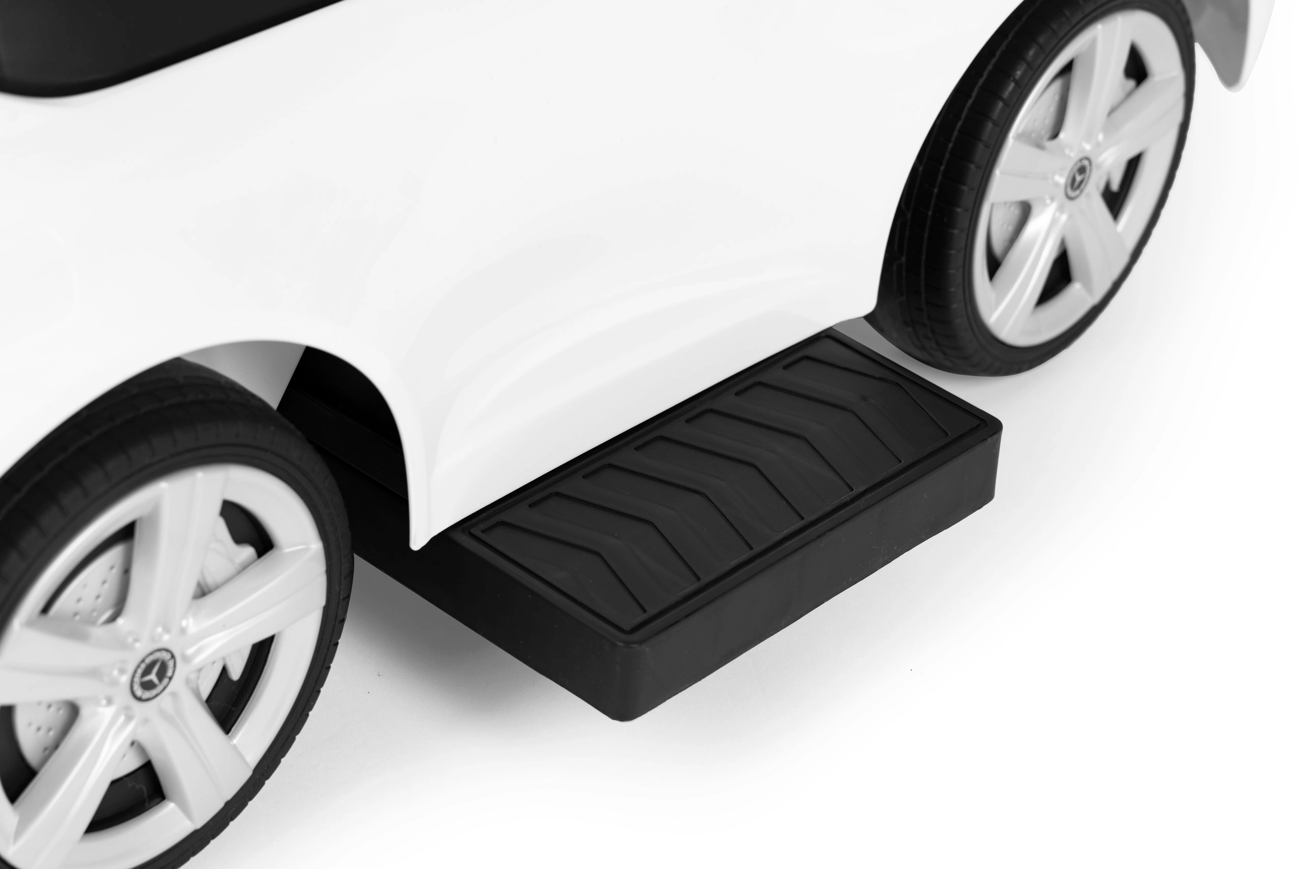 Porteur stylé sous licence MERCEDES C‑Class pour enfants dès 12 mois, offrant une construction sûre et stable, un dossier confortable avec poignée de guidage, des barrières de sécurité et un volant interactif avec klaxon et son de démarrage. Inclut un espace de rangement sous le siège et un élément anti-basculement. Charge maximale 25 kg.