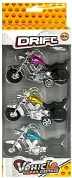 Ce coffret de trois mini motos réalistes offre de nombreuses heures de jeu et permet d’enrichir une collection. Grâce à la combinaison de pièces métalliques et plastiques, les modèles sont solides, durables et séduisent par leurs nombreux détails — du guidon à la selle jusqu’aux éléments « chromés ». Leurs dimensions compactes tiennent parfaitement dans les mains des enfants.