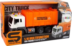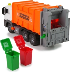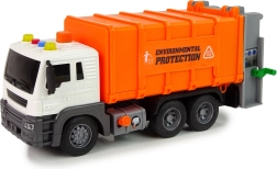 Découvrez un jouet amusant et éducatif qui encourage une attitude responsable envers la nature. Le camion-benne orange présente des détails soignés, une benne fonctionnelle et, grâce à un mécanisme simple, les enfants peuvent vider le contenu des poubelles dans le conteneur. Les effets sonores renforcent le réalisme du jeu et la motorisation à friction assure une conduite vive sans piles dans les roues.