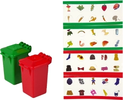 Des bacs colorés et des cartes avec des objets transforment le jeu en une activité éducative et ludique.