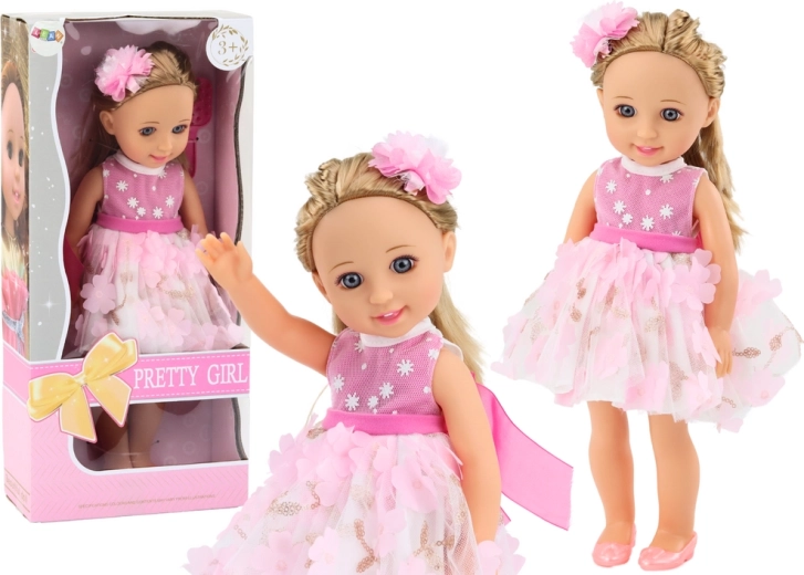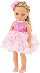 La poupée a de longs cheveux blonds qui peuvent être coiffés de différentes manières et est fournie avec une brosse pour peigner et coiffer. Ses cheveux sont en outre ornés d’une jolie barrette qui lui donne une touche spéciale. Elle est vêtue d’une belle robe rose et blanche, décorée de fleurs roses et d’accessoires dorés. La robe est élégante et stylée, idéale pour toutes les occasions. La poupée porte des chaussures roses qui s’accordent parfaitement à sa tenue. Elle a un maquillage délicat qui souligne son élégance, ainsi que des yeux et des lèvres soigneusement peints qui lui donnent de l’expression et du charme.
