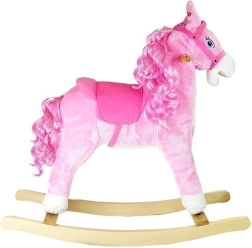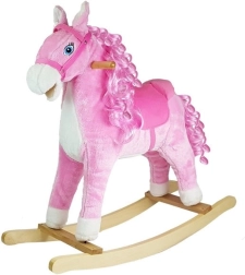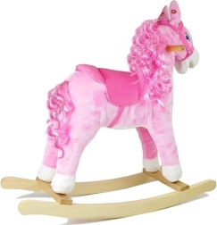 Découvrez le charme du jeu classique dans une version moderne. Ce cheval à bascule rose est fabriqué en peluche agréable pour une assise confortable et repose sur des patins en bois stables. Grâce à la selle ergonomique avec étriers et aux poignées en bois robustes, la chevauchée est sûre et amusante.