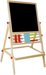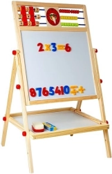 Le tableau est un accessoire indispensable : la petite artiste développera ses compétences artistiques en dessinant à la craie et pourra aussi apprendre à écrire et à compter. Il est équipé d’une étagère pratique pour les accessoires. Fabriqué de manière robuste avec des matériaux de la plus haute qualité. Finition soignée, sans bords tranchants. Pour dessiner sur le côté noir du tableau, utilisez des craies – trois couleurs sont incluses dans l’emballage. Il dispose d’un boulier avec des billes de 3 couleurs, grâce auquel l’enfant commencera l’aventure du calcul, et de l’autre côté, de cubes en bois avec des chiffres pour effectuer facilement des opérations mathématiques de base. Avec les chiffres et les signes mathématiques magnétiques, il peut apprendre les opérations de base comme l’addition, la soustraction et la multiplication. Au centre se trouvent des horloges sur lesquelles le tout-petit règle l’heure avec les aiguilles et apprend à la reconnaître.