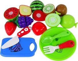 Ensemble fruits et ustensiles de cuisine pour enfants est idéal pour les petits chefs qui veulent découvrir le monde de la cuisine. L'ensemble contient des fruits en plastique avec découpe sécurisée, une petite assiette, une planche à découper et des couverts.
