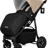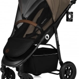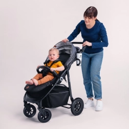 La capote XXL avec filtre UPF 50+ offre une protection fiable contre le soleil, tandis que le panneau de ventilation amovible favorise la circulation de l’air les jours chauds. La sécurité est assurée par un harnais 5 points, une barre amovible et des éléments réfléchissants sur la capote et le panier. Les parents apprécieront la poignée télescopique à 11 niveaux (75–113 cm), la poche derrière le dossier et le panier zippé d’une capacité de 3 kg.