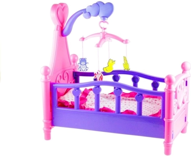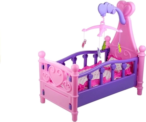 Ce berceau pour poupées au style soigné rappelle fidèlement un véritable lit d’enfant. La finition rose‑violet avec cœurs et ornements est complétée par un mobile avec petits animaux suspendus qui aide la poupée à s’endormir facilement. La literie moelleuse assortie au design du berceau est incluse.