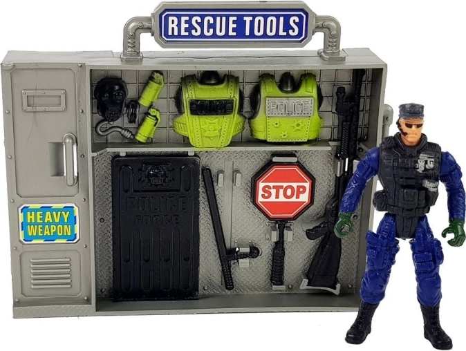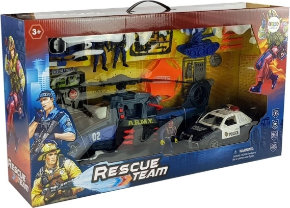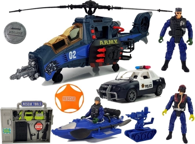 - Grand hélicoptère, voiture de police, kayak/bateau, figurine de policier, accessoires thématiques