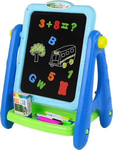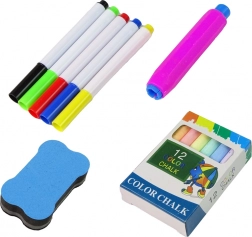 Le set comprend un ensemble complet : le tableau lui‑même avec pieds, 5 feutres de couleurs différentes (bleu, rouge, jaune, vert, noir), une éponge pratique pour effacer ainsi que 12 craies de couleur (2 de chaque couleur) pour écrire sur la face noire. Un porte‑craie permet de dessiner sans se salir les mains, et un lot d’aimants avec lettres, chiffres et signes offre un apprentissage dynamique et interactif.