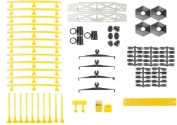 La boîte contient toutes les pièces, y compris ponts, connecteurs et accessoires, pour un montage stable et modulable du circuit.