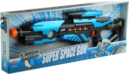 Avec ce pistolet cosmique, chaque jeune guerrier sera prêt pour des aventures incroyables. Le design noir et turquoise combiné avec des détails orange assure un aspect moderne. Le pistolet est équipé de plusieurs boutons - le premier pour activer le son, un autre pour changer la couleur des lumières LED, permettant de choisir parmi cinq couleurs : bleu, vert, rose, jaune et rouge. D'autres boutons changent le mode de l'arme et les sons de rechargement.