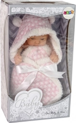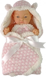 La poupée est habillée d’une couverture chaude rose avec un nœud blanc. Elle a des bras articulés, ce qui augmente l’interactivité et le réalisme du jeu. Elle est fabriquée à partir de matériaux certifiés de haute qualité garantissant la sécurité et une longue durée de vie du jouet.