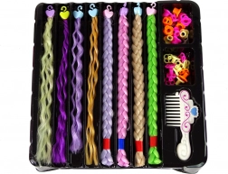 Le set comprend également huit tresses colorées, offrant encore plus de possibilités de style. Chaque tresse est munie de pendentifs décoratifs qui apportent éclat et élégance. Un peigne est aussi inclus, un outil indispensable pour réaliser des coiffures stylées.