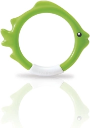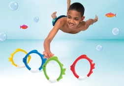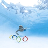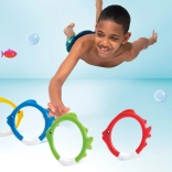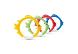 Ensemble ludique de quatre anneaux de plongée en forme de petits poissons pour enfants à partir de 6 ans. Les anneaux, en bleu, rouge, vert et jaune, se posent verticalement au fond lorsqu’on les jette dans l’eau, ce qui motive au travail de l’apnée et améliore les compétences de nage. Fabriqués dans un matériau souple et sûr pour une prise en main facile.