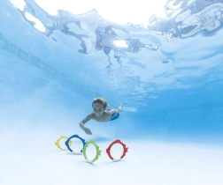 Une fois jetés dans l’eau, les anneaux se placent automatiquement debout au fond, offrant aux enfants une cible claire pour plonger et s’exercer de façon naturelle et amusante.