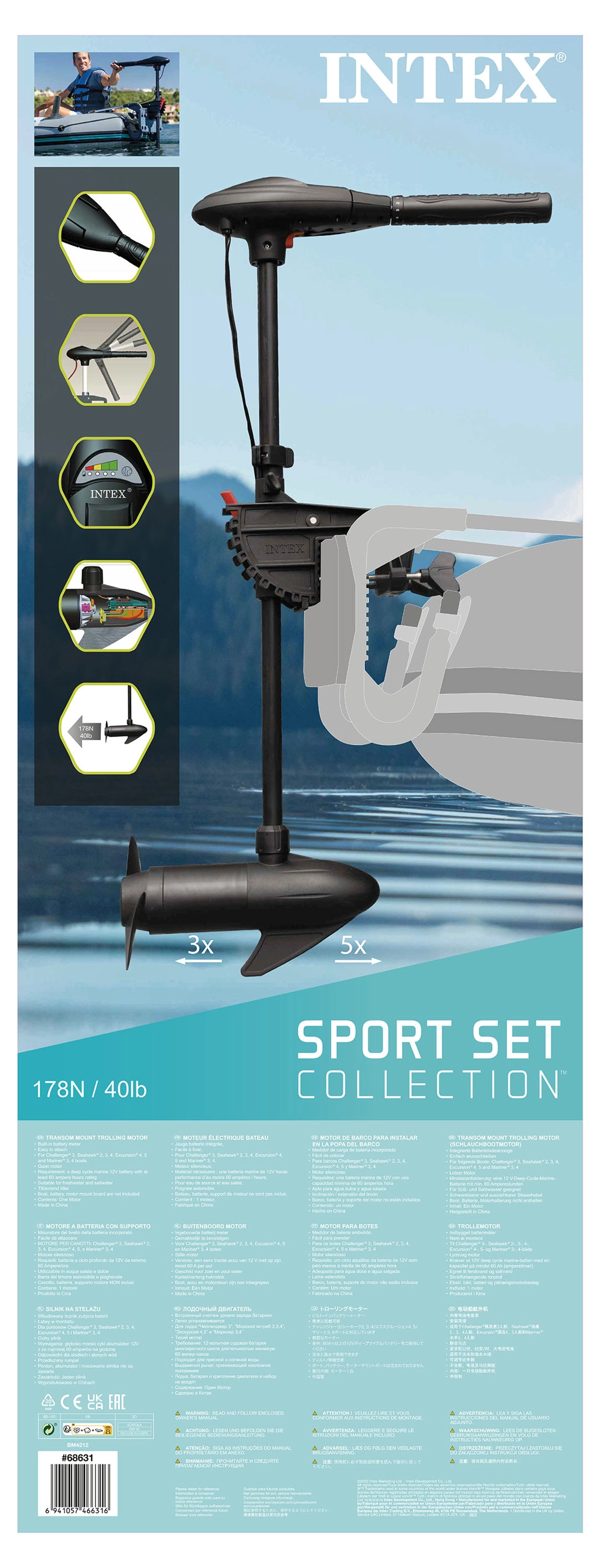 Le moteur d’une puissance de 420 W fonctionne en 12 V courant continu monophasé et est conçu pour un montage rapide sur le tableau arrière de la plupart des bateaux pneumatiques des marques Seahawk, Excursion, Seahawk II, Mariner et Challenger. Sa construction robuste convient également à l’eau salée, idéale pour les sorties en mer ou en eaux saumâtres.