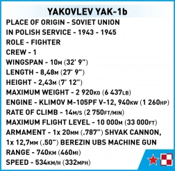 Les pièces de construction vous permettent de réaliser une réplique fidèle de l'avion Yakovlev Yak-1b, qui a joué un rôle clé dans l'aviation pendant la 2e guerre mondiale.