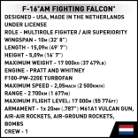 Avec les 425 blocs de construction COBI, vous pouvez construire cet avion de chasse emblématique avec des détails à l'échelle 1:48. Le modèle inclut les missiles AIM-9 Sidewinder et AIM-120 AMRAM, amovibles et adaptables. Le set inclut également une figurine de pilote avec un masque à oxygène et un casque doté de marquages des forces aériennes néerlandaises.