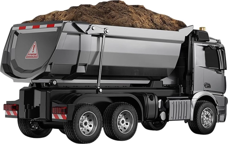 La télécommande 2,4 GHz assure un pilotage fluide, la gestion des lumières et sons, ainsi que la levée/descente électrique de la benne. Pratiques également : appairage automatique et mode économie d’énergie. Les grandes roues avec pneus à bande de roulement en caoutchouc gardent la trajectoire sur divers revêtements, et le réglage du pincement du train avant est possible.