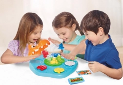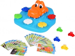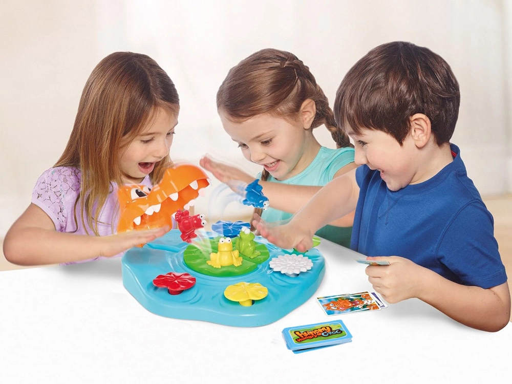 Ce jeu de société interactif avec crocodile apporte tension et amusement à chaque manche. Les joueurs retournent des cartes d’animaux – dès que le crocodile apparaît, il faut réagir en un éclair et appuyer sur son nénuphar. Celui qui échappe le plus souvent aux mâchoires du crocodile en cinq manches l’emporte !