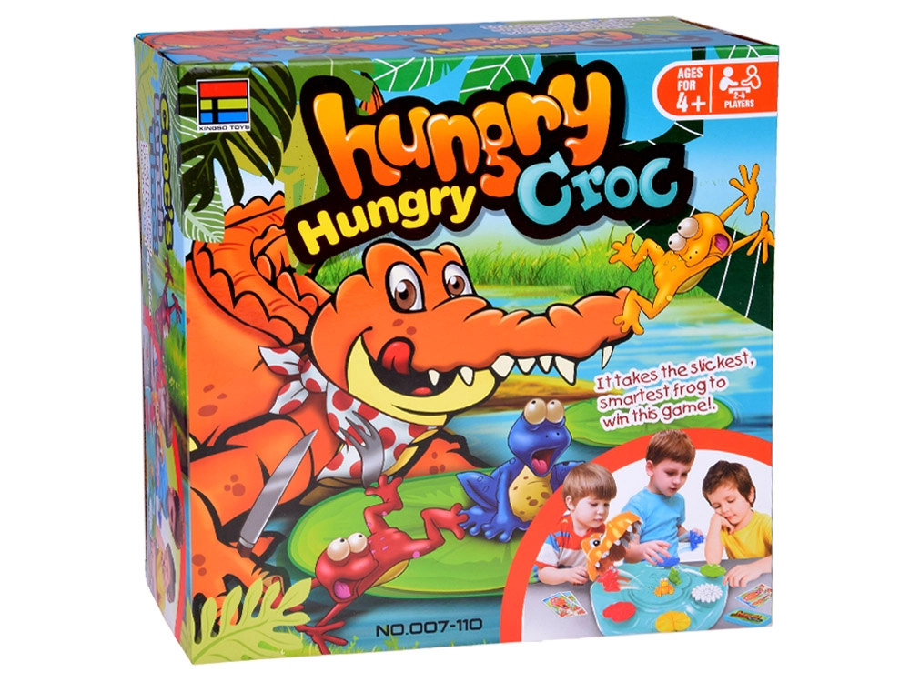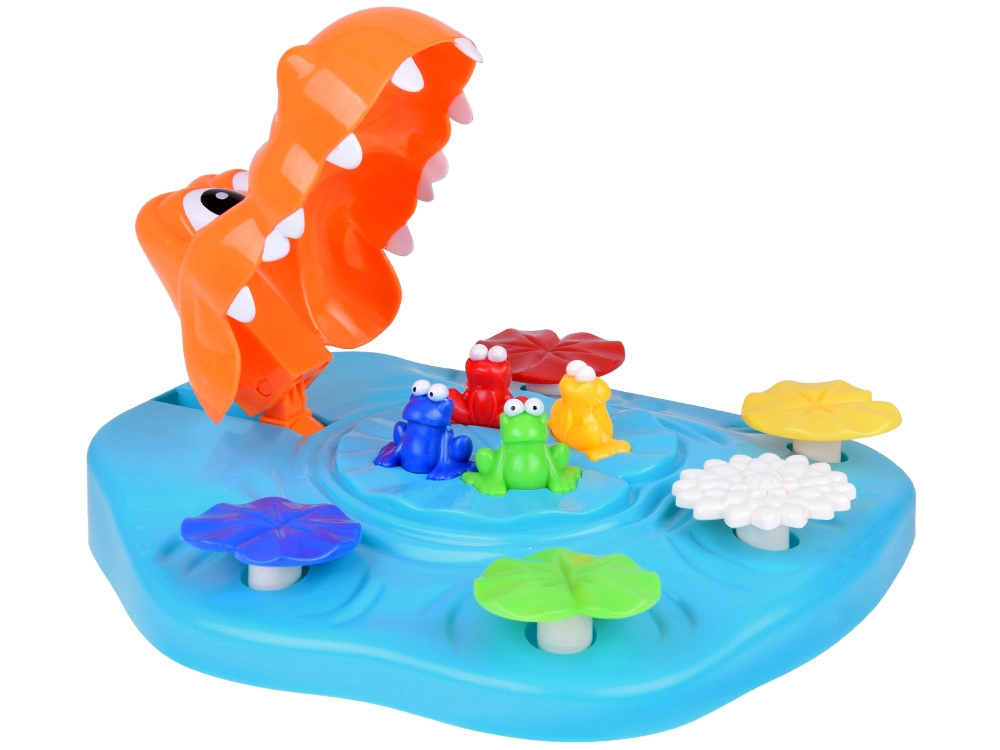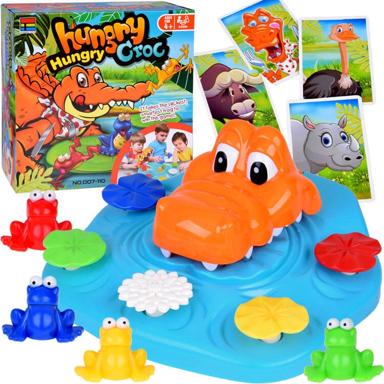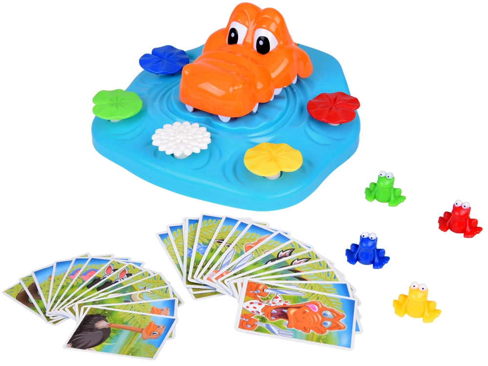 - crocodile avec base de jeu, grenouilles colorées, paquet de cartes, notice
