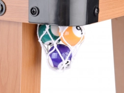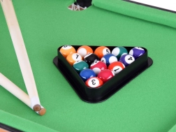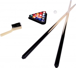 Deux queues, un jeu de boules colorées, un triangle, de la craie et une brosse – tout est prêt pour jouer immédiatement et pour un entretien facile.