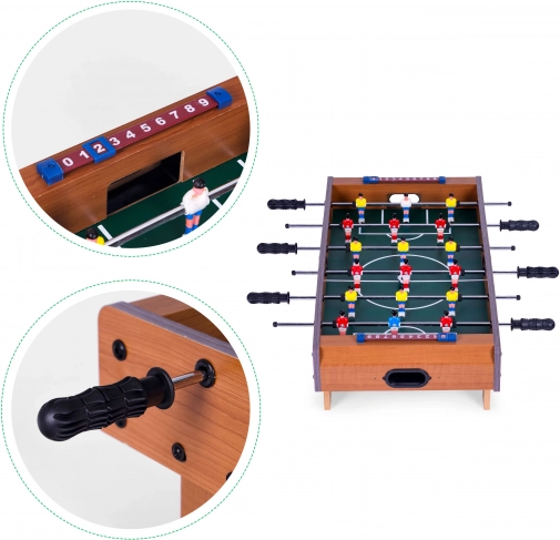 Le mini baby-foot ECOTOYS est un excellent choix pour les réunions en famille et entre amis. Deux compteurs de points et des poignées antidérapantes assurent un jeu facile et confortable pour deux joueurs. La structure en matériaux bois est compacte, avec des dimensions de 70x35 cm, ce qui permet d’installer la table même dans des espaces réduits.