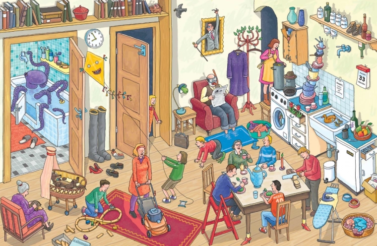 Ce livre grand format invite les enfants dans des scènes hautes en couleur pleines d’absurdités joyeuses – du chaos domestique aux rues animées, en passant par des aventures ludiques en plein air. Chaque page est richement illustrée et remplie de petites histoires qui incitent à explorer, raconter et rire ensemble.