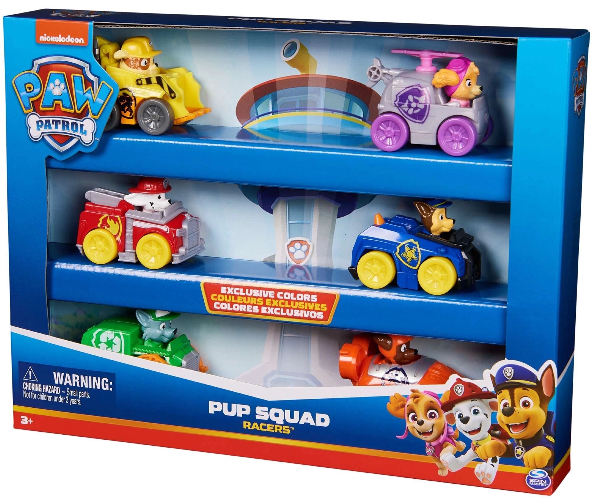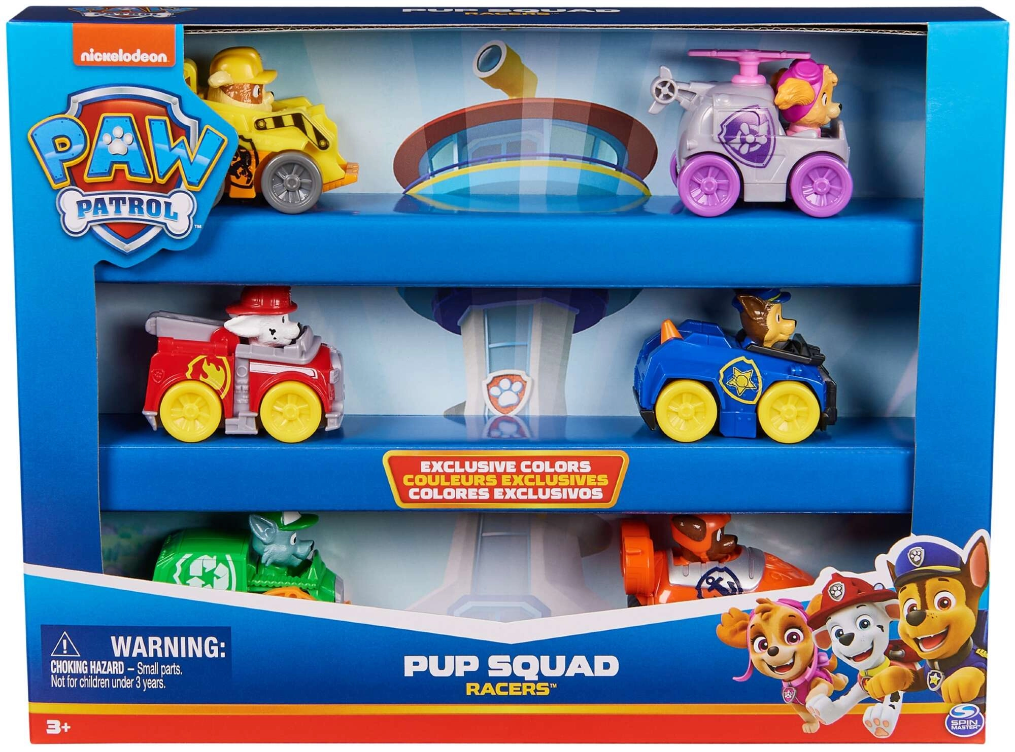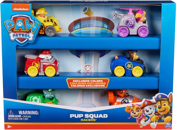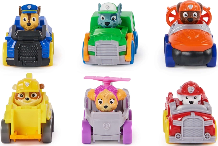 Le set Pup Squad Racers propose six véhicules détaillés avec des figurines fixes des héros de PAW Patrol – Chase, Marshall, Skye, Rocky, Rubble et Zuma. Les voitures sont fabriquées en plastique résistant, se poussent pour avancer et, grâce à leurs petites dimensions, sont faciles à manipuler et à emporter.