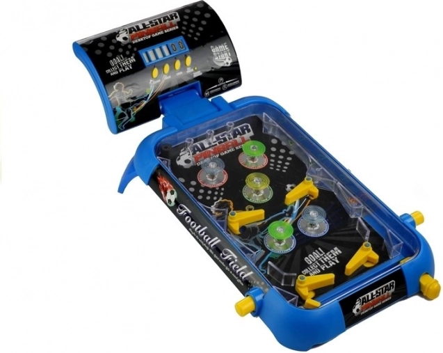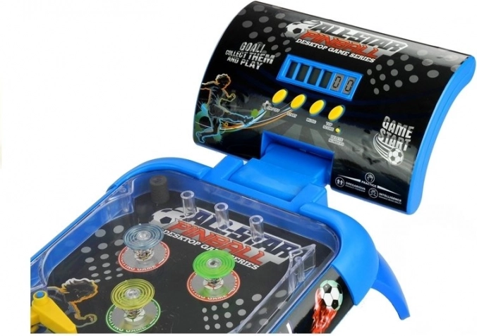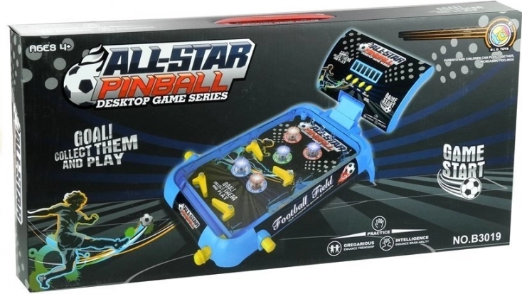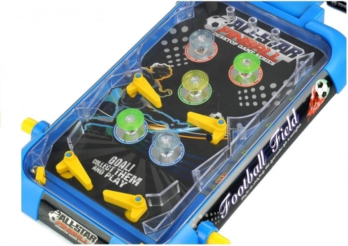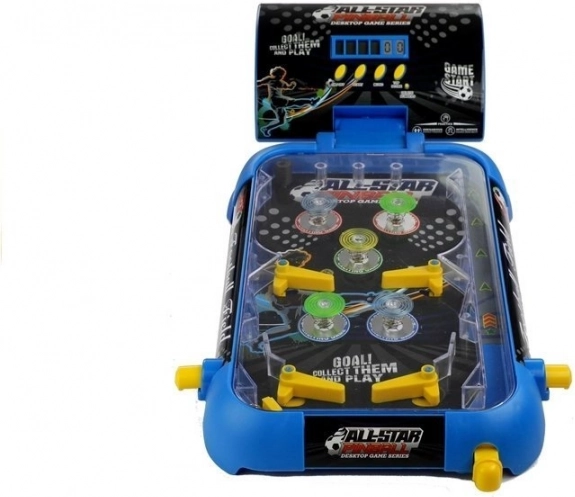 Le design du flipper ressemble à une version réduite d’une machine d’arcade classique. Le plateau est relié à deux pieds et à un compteur de score, dont la position peut être ajustée selon les besoins du joueur. Grâce aux pieds, le plateau est incliné pour un jeu optimal et pour faciliter la projection de la bille vers le haut. Un grand atout du jouet est son design décoré de motifs de football. La coque bleue du plateau se combine à un fond sombre, qui paraît sensationnel une fois les lumières colorées allumées. Après avoir alimenté le jeu avec des piles, appuyez sur le bouton ON/OFF puis sur le bouton START à côté. Pour ajouter des sons à l’excitation du jeu, il suffit d’appuyer sur le bouton musique. Le dernier bouton est intitulé TOP SCORE; en l’actionnant, le score le plus élevé s’affiche. Nous pensons que cette fonction peut vous motiver à donner encore plus lors de la prochaine partie. Si nécessaire, ce compteur peut être réinitialisé pour recommencer depuis le début.