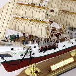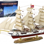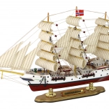 Ce modèle de navire de collection *Sorlandet* représente une réplique parfaite d’un voilier traditionnel. La base en bois avec le nom du navire ajoute à l’authenticité, tandis que le drapeau norvégien au sommet souligne l’origine du bateau.