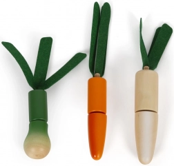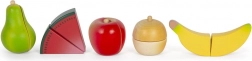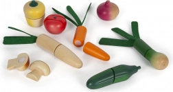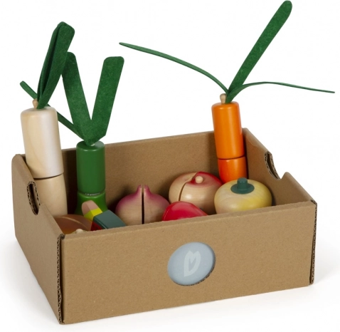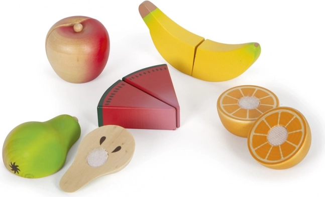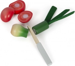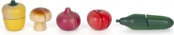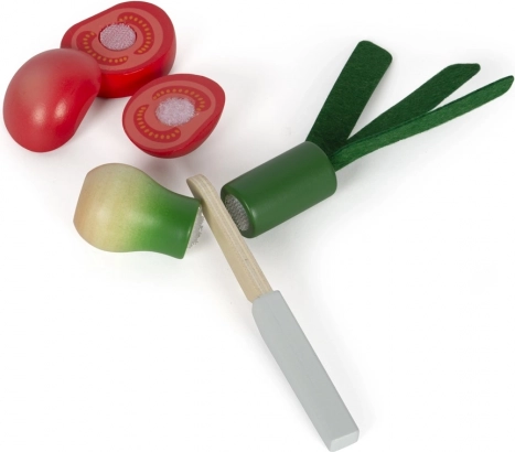 - Comprend un couteau en bois, une tomate, un concombre, une carotte, une pomme, une banane, un champignon, un poivron, un oignon, un poireau, une orange, une pastèque, une poire et un radis (panais).
