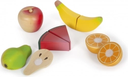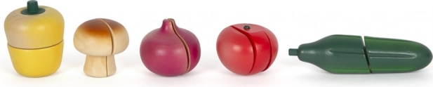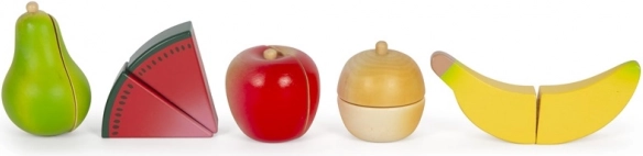 Les aliments sont reliés par du velcro, ce qui permet de les « couper » avec le couteau en bois fourni. Les enfants peuvent ainsi jouer à cuisiner comme les adultes.