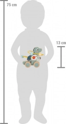 Le dinosaure propose un jeu de déplacement sur roulettes et un labyrinthe interactif de perles, développant ainsi les capacités motrices fines et globales des enfants.