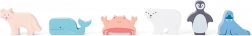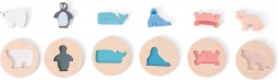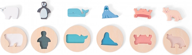Ce puzzle d’encastrement en bois de qualité allie jeu et apprentissage. Les animaux — phoque, ours polaire, crabe, pingouin, renard et orque — s’insèrent dans des jetons ronds avec découpe en silhouette et couleur correspondante, ce qui facilite l’orientation et renforce la reconnaissance des couleurs et des formes.