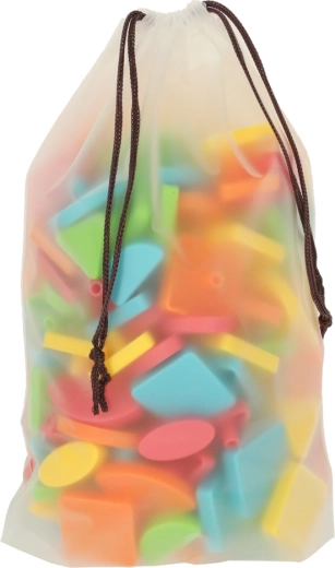 Le set comprend 170 pièces en plastique en 5 couleurs et différentes formes, un plateau de jeu, 10 cartes d’inspiration recto-verso et un sachet refermable pour un rangement facile. Les dimensions compactes du plateau permettent un transport et un stockage pratiques.
