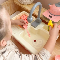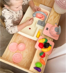 Les enfants jouent facilement aux cuisiniers et aux aides à la maison : ils servent, découpent, lavent et rangent. Ainsi, ils acquièrent en douceur les bases de l’hygiène et une approche écologique de l’eau, tandis que les parents apprécient un coin de jeu plus ordonné.