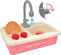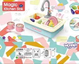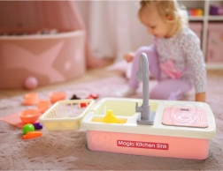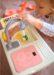 Découvrez un évier interactif qui, après insertion de 2 piles AA, active une pompe avec circulation d’eau – les enfants peuvent “vraiment” laver la vaisselle, rincer les fruits et s’exercer à une gestion économe de l’eau. Le riche set de vaisselle, d’aliments à découper avec velcro et d’accessoires de cuisine développe l’imagination et les compétences de coordination.