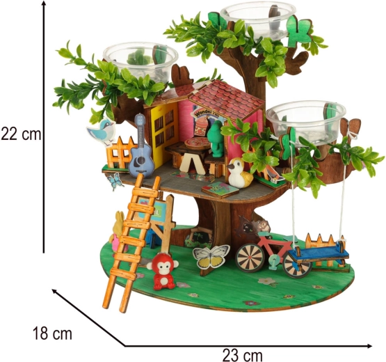 Découvrez un projet ludique et éducatif où les enfants construisent eux-mêmes une maison dans l’arbre stable, la décorent avec des peintures et l’animent avec des figurines d’animaux. Grâce aux coupelles fournies, il est possible de semer des graines (graines non incluses) et de suivre leur croissance dans un carnet clair. Le kit développe les habiletés manuelles, la coordination et la patience.