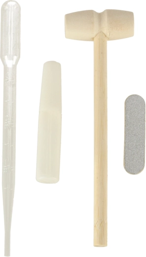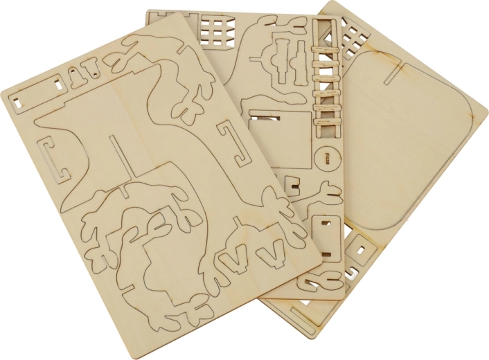 - pièces en bois, autocollants, carnet de croissance, corde, plantes artificielles, petit marteau en bois, compte-gouttes, 4 figurines d’animaux, peintures, 2× pinceau, 3× coupelle en plastique