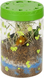 Le récipient en plastique transparent avec des ouvertures de ventilation est idéal pour planter les graines fournies. Le kit comprend de la terre et des pierres colorées que les enfants disposent selon les instructions. Les LED dans le couvercle du terrarium soutiennent la croissance des plantes tout en offrant un éclairage nocturne doux.