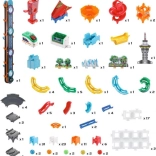 Le coffret comprend 143 pièces, 10 billes, un petit train électrique avec wagon, un ascenseur électrique, des autocollants colorés et un manuel détaillé en tchèque. Le circuit peut être relié à d’autres sets pour un amusement sans fin.