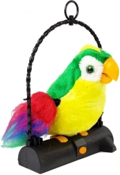 Un perroquet bicolore ressemble à un vrai – il est recouvert d’une matière agréable au toucher, associée à un bec et des pattes en plastique. L’oiseau parlant est placé sur une large perche, imitation d’un morceau de bois, combinée à un demi-cercle de suspension. La construction du jouet permet aussi bien son installation sur une surface plane que sa suspension – nous pensons que dans les deux cas il a fière allure.