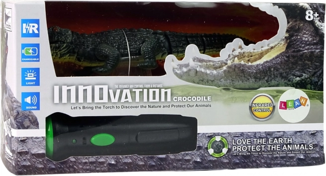 Il est livré avec une télécommande spéciale en forme de lampe de poche à trois boutons (avant, arrière, mode de contrôle). Le crocodile réagit à la lumière et la suit — la lumière est son « pilote ». En maintenant le bouton environ 7 s, vous lancez le mode démonstration automatique. Le jouet possède la certification CE et est fabriqué à partir de matériaux sûrs et testés, sans bords tranchants.