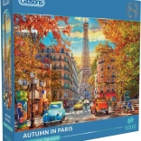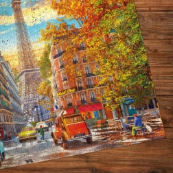 Découvrez le charme de Paris à l'automne avec ce magnifique puzzle de 1000 pièces. L'illustration capture une scène avec un artiste en béret peignant sous la tour Eiffel, entouré de feuilles dorées et de paisibles ruelles parisiennes.
