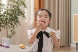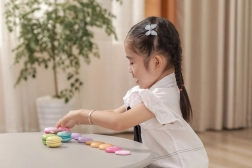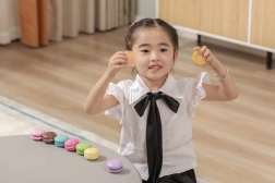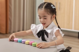 Les deux moitiés de chaque macaron sont reliées par un velcro – les enfants peuvent les séparer et les recomposer pour inventer de nouvelles « saveurs » tout en entraînant leurs doigts et leur coordination.