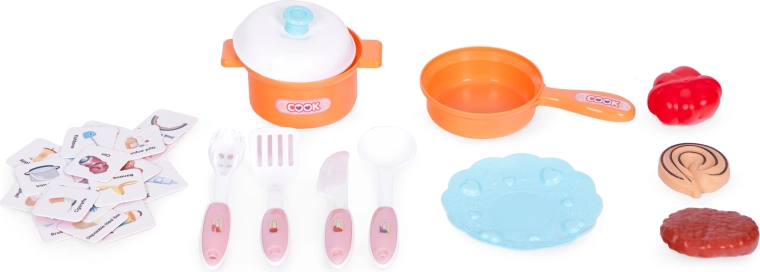 Casseroles, poêle, assiettes, couverts et aliments complétés par un puzzle qui apprend le bon tri des déchets – un divertissement associé à l’apprentissage.