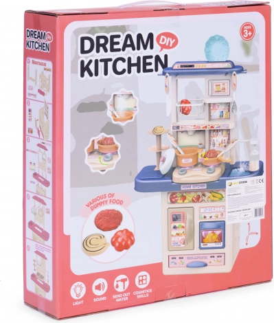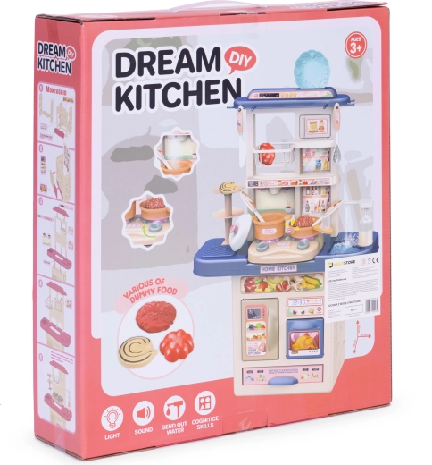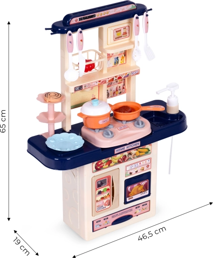 La cuisine a des dimensions compactes pour une installation facile dans la chambre, des placards ouvrants et des espaces de rangement pour tous les accessoires. Elle est sûre, sans bords tranchants, adaptée aux enfants à partir de 3 ans et permet à plusieurs enfants de jouer en même temps.