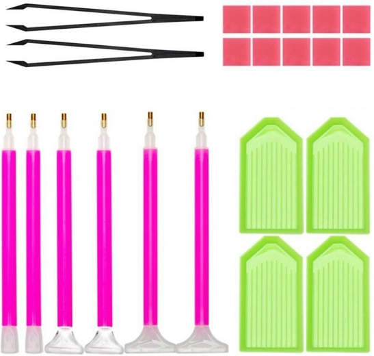 Ensemble de 22 accessoires pour la broderie/peinture diamant. Kit complet pour commencer votre aventure avec la mosaïque diamant. Le set comprend 6 stylos avec embouts manuels, 2 pinces, 4 plateaux pour diamants et 10 carrés de colle.